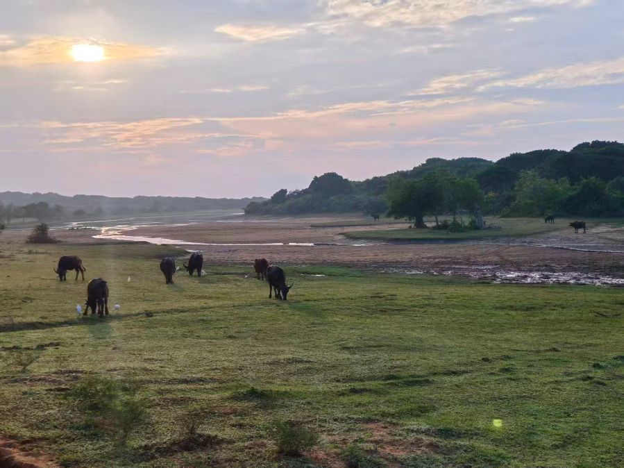 清晨的雅拉,薄雾还没散尽,软软地裹着整片草原。阳光从云隙里漏下来,把天际染成暖融融的金橘色,连草叶上的露珠都跟着亮了。几头水牛慢悠悠地啃着青草,牛角被晨光打磨得温润,偶尔甩甩尾巴,惊起身旁的白鹭。白鹭扑棱两下,落在不远处的草尖上,又静静陪着,像约好了似的。远处的河道泛着银光,蜿蜒进林子深处,风里有草木和泥土的潮气,湿漉漉的,很清甜。
